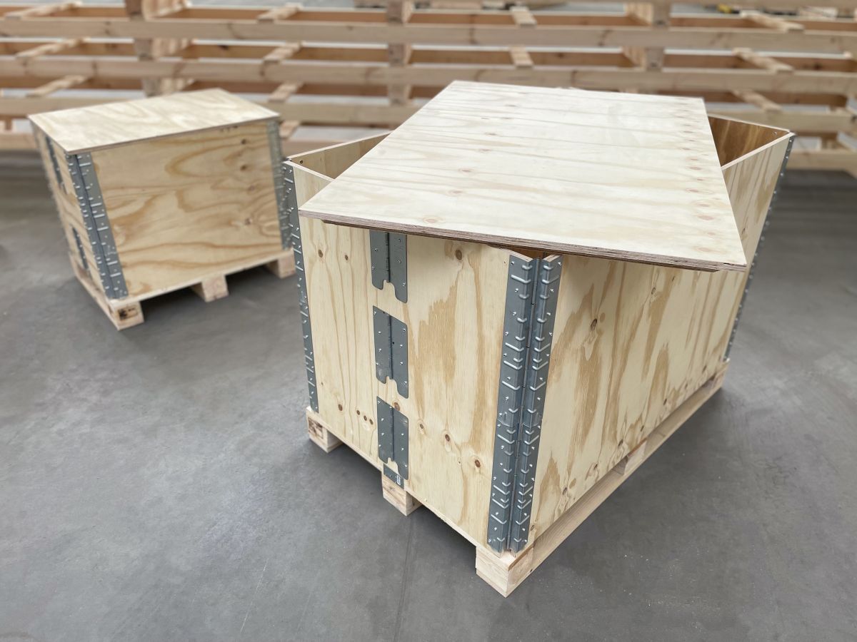 skrzynie składane ze sklejki 12,15 i 18 mm z zawiasami prostymi, kątowymi i zaczepami burtowymi;